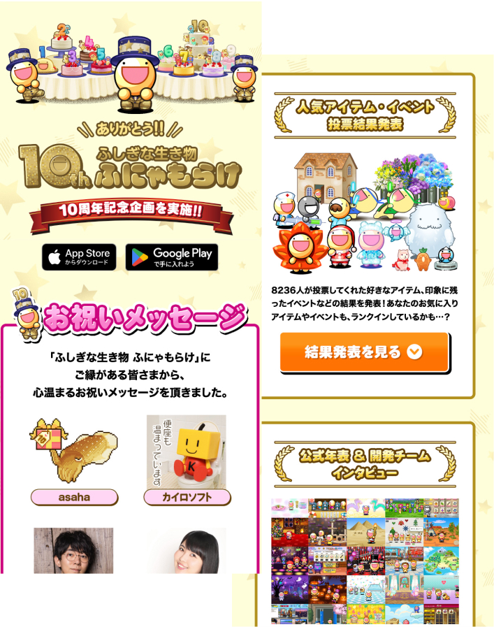 キャラクター育成ゲームアプリの10周年を記念した特設ページを制作しました。アニバーサリーの特別感とキャラクターの世界観に合った賑やかで可愛らしいデザインになるよう配慮しました。