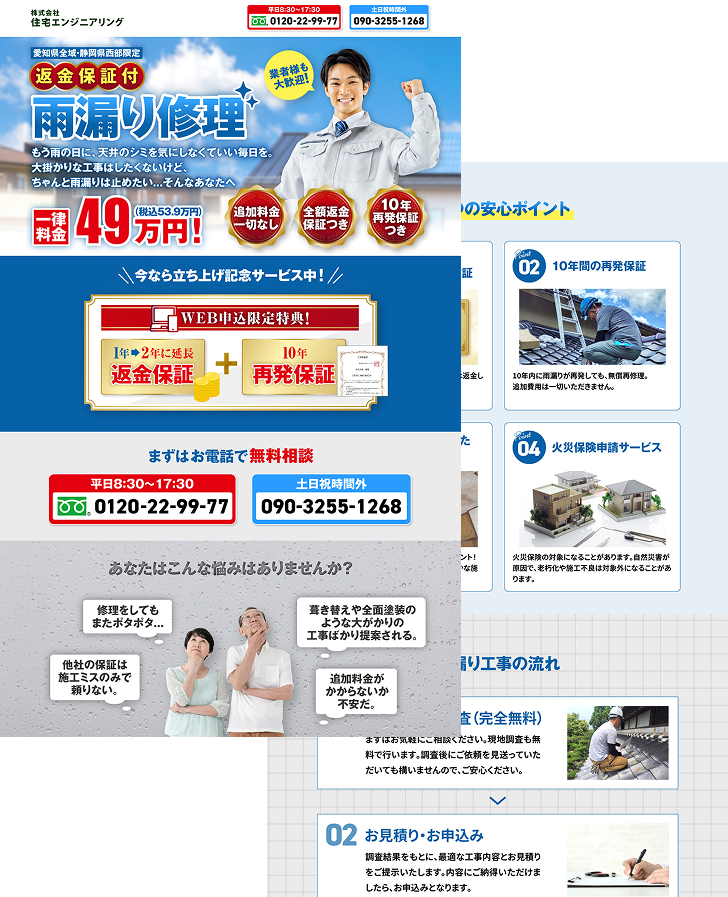 家持で雨漏りに困っている高齢者に向けた修理サービスのLPを制作しました。大規模工事は望まず費用を抑えたい、他社に依頼したが雨漏りが止まらないなどの悩みがある方に訴求したいとのご要望を踏まえてデザインしました。他社にはない保証がついていることなど独自の特徴も伝わるよう配慮しています。