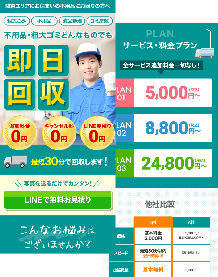 不用品回収業者のLPを制作しました。「即日で不用品を片付けたい」「追加料金が心配」という利用者の不安の声を意識しました。 料金やスピードに関する不安を払拭し、手軽に依頼できるサービス設計を強調して制作しました。