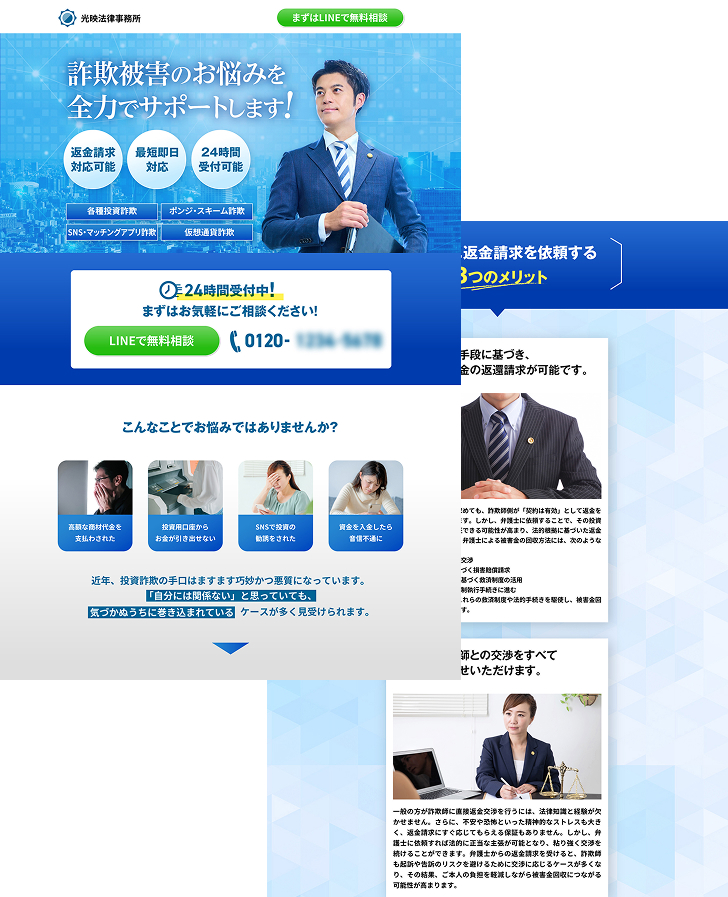 詐欺被害に悩む人が安心して相談できるよう、信頼感を与える青を基調にした配色を採用しました。即日対応・24時間受付などの強みをアイコン化し視覚的に強調しました。LINE相談や電話へ自然に誘導できる導線設計で、スムーズに行動につながるUIを目指しました。法律系の写真も多用し、信頼感を強めています。