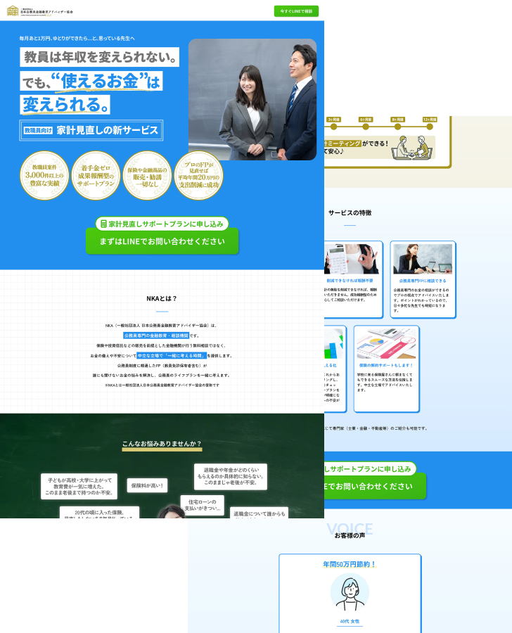 お金の悩みを持つ教職員に向けた家計見直しサービスへの申し込み用LPを制作しました。公務員制度に精通したFPを探している人、教職員のライフプランに悩んでいる人に向けてサービスを認知させます。豊富な実績と専門のFPに相談できる安心感が特に伝わるよう構成を組み立てました。最終的に個別相談(LINE登録)に促します。