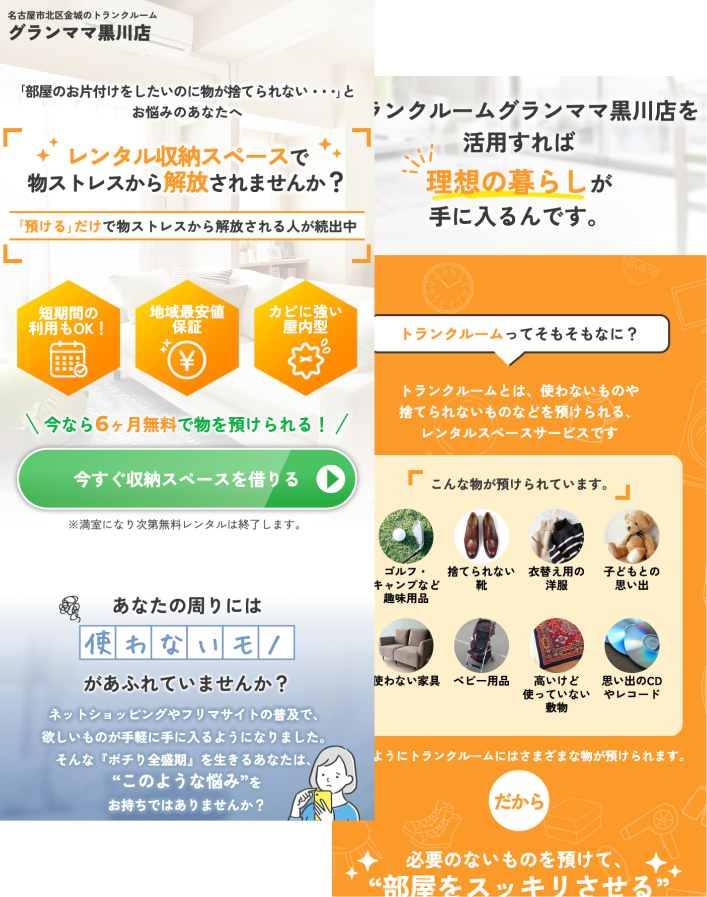 片付けや引っ越し、物が捨てられずに悩んでいる人に向けたトランクルームの申し込み用のLPを制作しました。